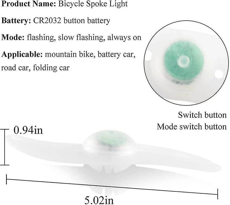 [Safe and cool lights]These LED bicycle wheel lights feature high brightness and low power consumption, to increase your visibility and safety when riding your bicycle in the dark or in rainy weather. Perfect for your safety and the decoration of your bike. [EASY TO INSTALL]Made of superior ABS and electronic components, lightweight, eco-friendly and durable. The bicycle spoke lights adopt the unique willow leaf design, no tools required, directly installed on the wheel wire [WATER RESISTANT] The surface of the bicycle spoke lights has excellent waterproof performance, water resistant and shockproof. Stay securely locked in position even during off-road use. [EASY TO USE]The bike tire lights can be switched to 3 patterns by pressing the rubber dome shape – strobe, flashing and solid. You can select the flashing model you like, it is the ideal accessory for social routes, parades and bike parties. [USE FOR]Suitable for most bicycles, such as childrens bicycle, folding bicycle, road bicycle, mountain bicycle, etc. is a good gift for family/friends/kids