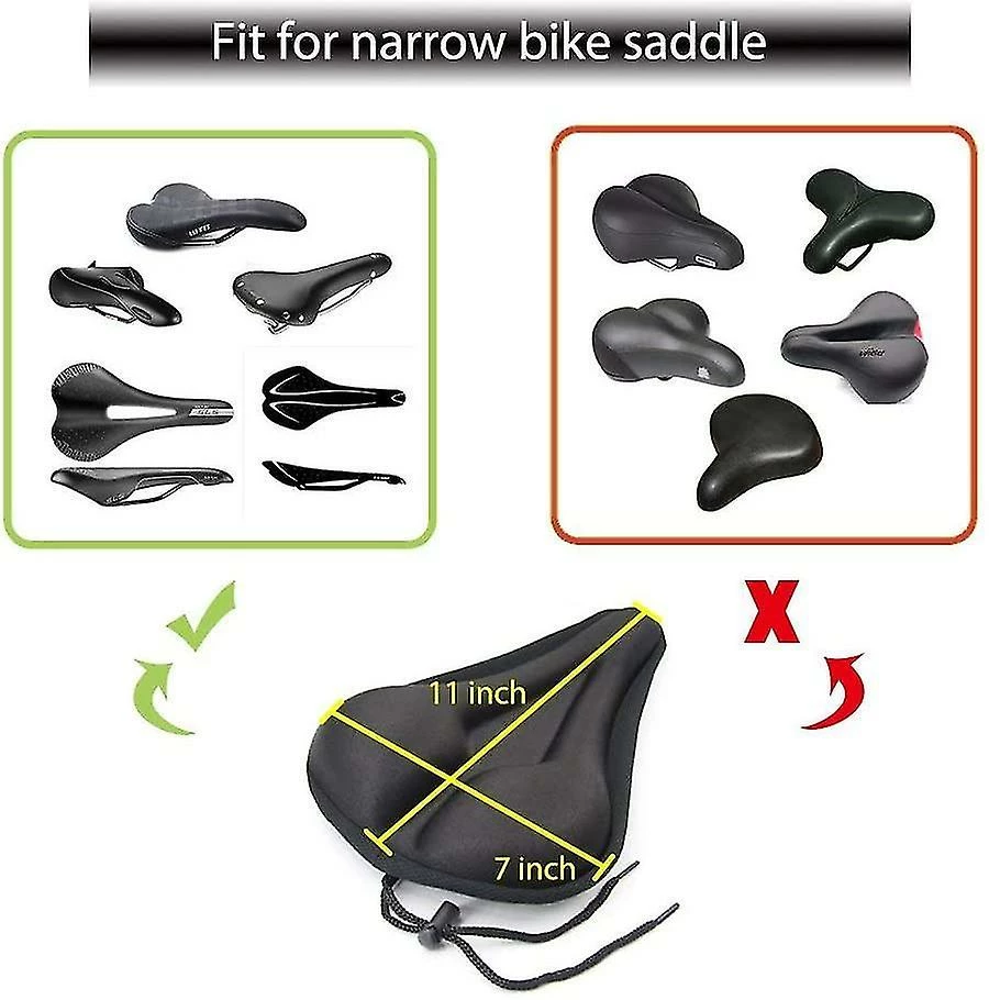 Universal Size — This cushion fit for most of narrow bike saddles, which with maximum length of 11 inch and width of 7 inch. Adjustable draw cord allows you to cinch it down for an even better fit. But please note the size to make sure appropriate purchasing. Iddition, there is a Dust Resistant saddle cover is available to protect your bike from blazing sund rain wheot in use.